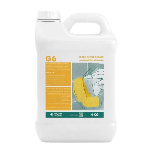 منظف الروبة الايبوكسي G6، براند بولى ود، منظف عالي اللزوجة لتنظيف بقايا روبة الإيبوكسي، والبقع والزوائد من اسطح الحوائط والأرضيات للإستخدام على البورسيلين والسيراميك والموزياك الزجاجي فعال أيضا في إزالة البقايا المتصلبة والكبيرة، كما يمتاز في إزالة بقع الماء العسر والرواسب الجيرية وترسبات الصابون.