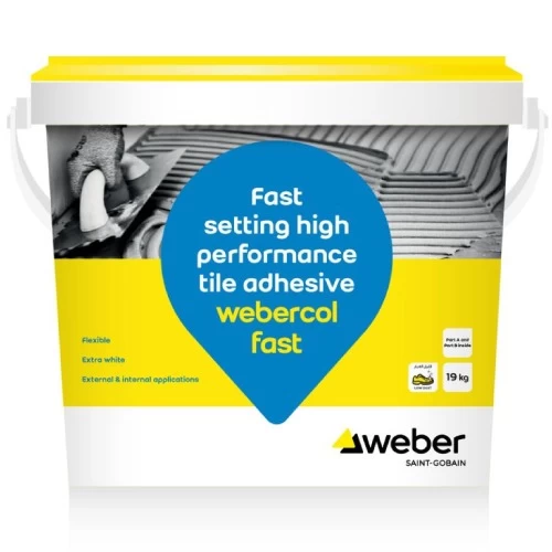 لاصق بلاط منخفض الغبار Webercol Fast ، براند سودامكو- ويبر، يتميز بقدرتة على مقاومة الماء ومصمم خصيصا لتطبيقات الجدران والأرضيات الداخلية والخارجية ، وخصائص الاعداد السريع تجعله مثاليا لتبليط المناطق التي تحتاج إلى حشوها والوصول إليها في غضون ساعات قليلة مثل (المتاجر والمستشفيات والمواقف التجارية والمنزلية).