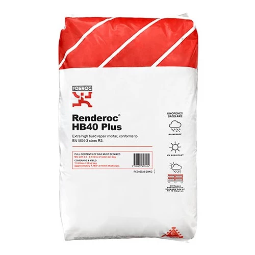 مونة اصلاح اسمنتية مقاومة للانكماش الفوسام Renderoc HB40 Plus، حجم 20 كجم، عالية البناء، تستخدم في إعادة الخرسانة إلى حالتها الأصلية من 25 - 50 ميجا باسكال، كما يمكن استخدامها للتطبيقات الرأسية / العلوية من 10 مم إلى 100 مم، خالية من المخاطر، سهلة الإستخدام.