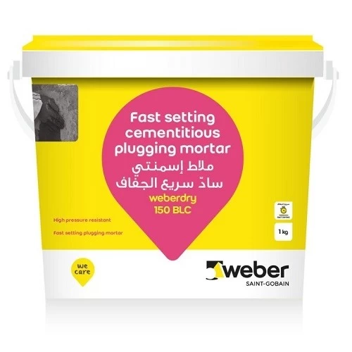 ملاط اسمنتي weberdry 150 BLC من شركة سودامكو ويبر، مسحوق جاف مكون من إسمنت هيدروليكي خاص سريع التصلب، يمنع التآكل ويقاوم ضغط المياه العالي، لا يحتوي على مواد ضارة أو مسببة للتآكل، يستخدم في مجموعة واسعة من التطبيقات مثل تسربات المياه في الأقبية، غرف المصاعد، الممرات السفلية، الخزانات، الفواصل، تشققات