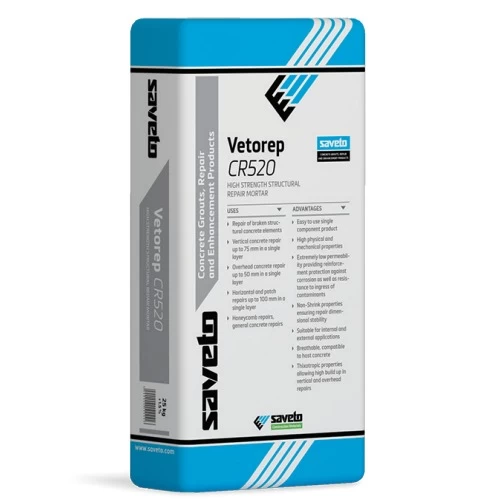 مونة اسمنتية لإصلاح الهياكل الخرسانية Vetorep CR520، شركة سافيتو، حجم 25 كجم، لاصلاح العناصر الخرسانية الهيكلية العمودية والعلوية والافقية ، تتميز بنفاذية منخفضة للغاية توفر حماية ضد التآكل و مقاومة دخول الملوثات، للتطبيقات الداخلية والخارجية .
