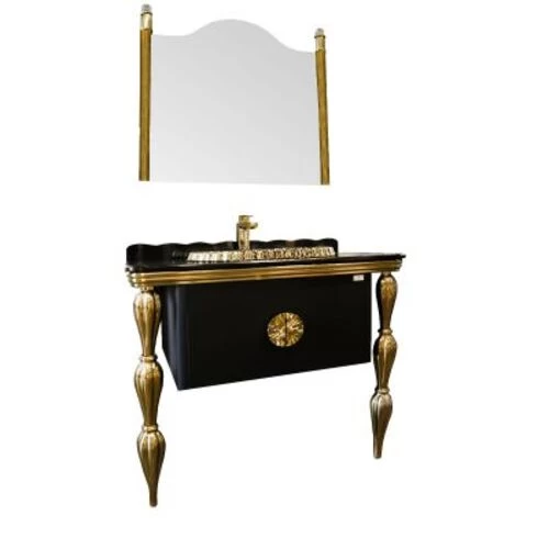 كابينة حمام مع مغسلة مع مرآة، لون أسود مع زخرفة ذهبي، 101 سم | مجموعه سمايل