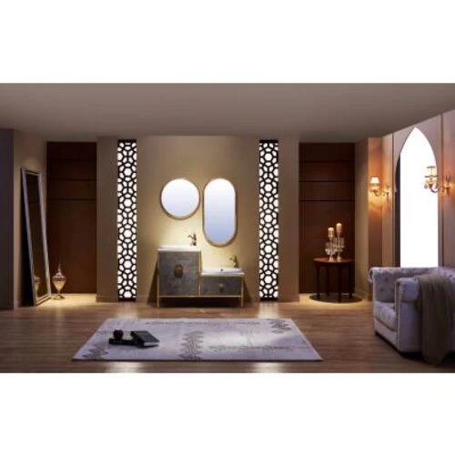 وحدة حمام مزدوجة مع 2 مغسلة و2 مرايا، تصميم كلاسيكي، رمادي مع زخرفة ذهبي، مقاس 125 سم ، متوفرة بتصاميم وألوان متنوعة لتناسب جميع أنماط الحمامات وتلائم مختلف الأذواق.