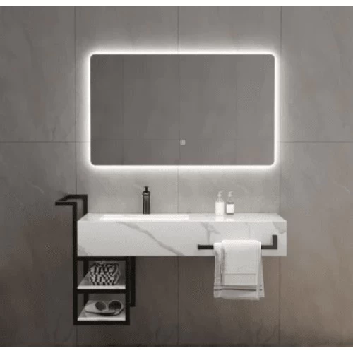 مغسلة رخام صناعي مع حوض من السيراميك ومراية ليد و ارفف سوداء، مصنعة من مواد عالية الجودة، مما يجعلها مقاومة للخدوش والبقع والتصدعات. تتميز بمظهرها الجذاب والأنيق وتوفير مظهر فاخر وعصري على ديكور أي حمام. كما تتوفر بأشكال وأحجام وألوان مختلفة لتناسب جميع الأذواق والأنماط الديكورية.