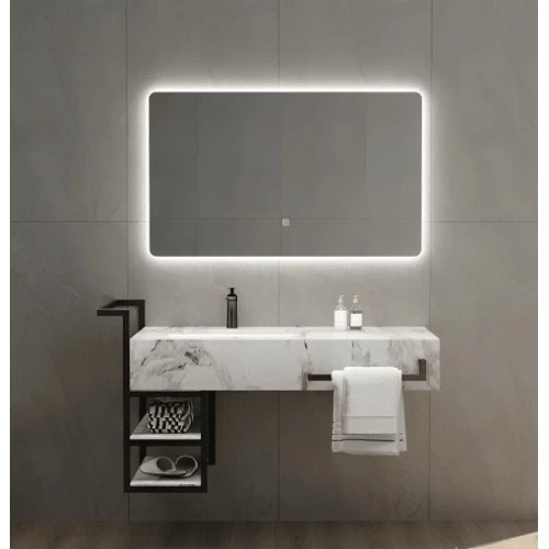 مغسلة رخام صناعي حوض واحد مودرن مع مرايا و ارفف سوداء، حيث انها مزودة بإنارة ليد في منتصف المغسلة لتعطي مظهر انيق كما انها مصنعة من مواد عالية الجودة، مما يجعلها مقاومة للخدوش والبقع والتصدعات. تتميز بمظهرها الجذاب والأنيق وتوفير مظهر فاخر وعصري على ديكور أي حمام. كما تتوفر بأشكال وأحجام وألوان مختلفة لتناسب جميع الأذواق والأنماط الديكورية.