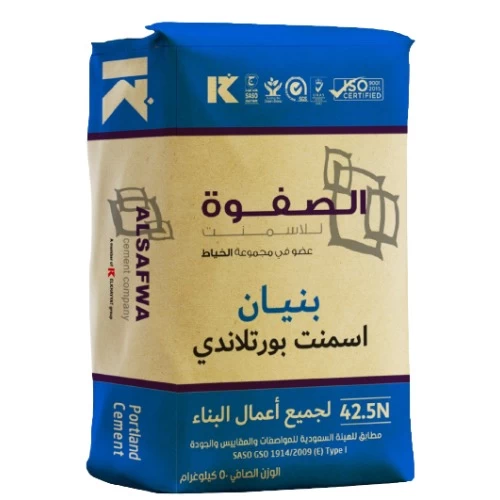 اسمنت بورتلاندي الصفوة لأعمال البناء ، وزن 50 كيلو ، لون رمادى ، يستخدم في صناعة الحوائط مسبقة الصب و الخرسانة عالية المقاومة و الأنابيب والأنفاق والمنشآت الخرسانية ، مثالي للمباني السكنية الصغيرة ، يتميز بقوة صلابته ذات مقاومة عالية .