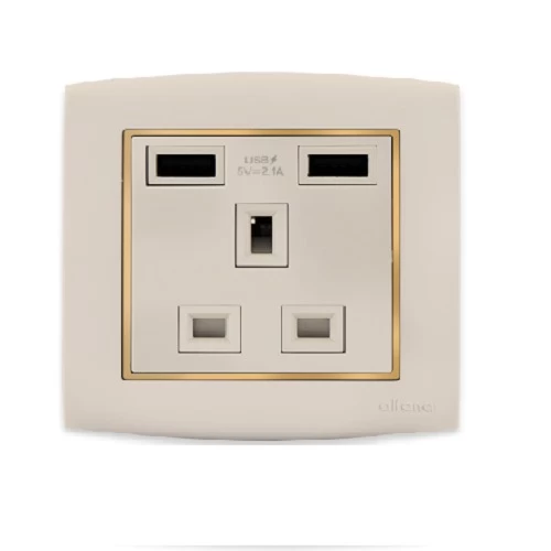 فيش كهرباء مع شاحن USB (2.1 امبير) مزدوج 13 امبير أمنية مقاس 7×7 سم اللون الذهبي باطار ذهبي براند الفنار ، مجهزة بإطار معدني لقوة التحمل. وهي مختومة بعلامة الجودة وتأتي مع ضمان استبدال المنتج.