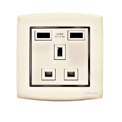 فيش كهرباء مع شاحن USB (2.1 امبير) مزدوج براند الفنار ، تتميز بمظهر أنيق وعصري ومجهزة بإطار معدني لقوة التحمل. وهي مختومة بعلامة الجودة وتأتي مع ضمان استبدال المنتج.