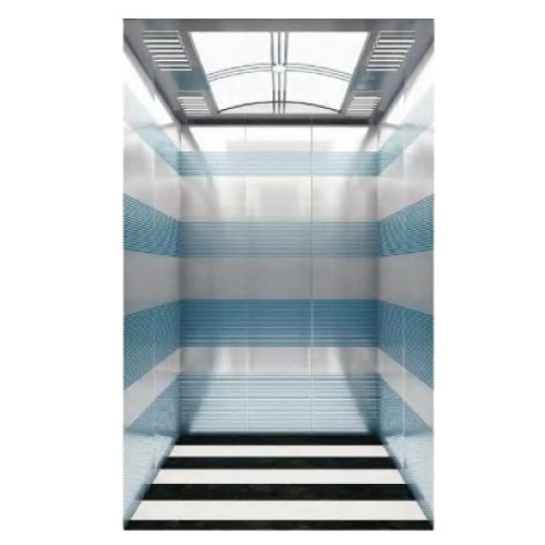 مصعد ركاب مزوّد بغرفة ماكينة صغيرة، يتميّز بتصميم عصري عملي مع استخدام خامات مقاومة وذات مظهر جذاب. الجدران مصنوعة من ستانلس ستيل محفور بطبقة PVD لمقاومة التآكل والخدش مع لمسة عصرية لامعة. السقف يضم إطارًا معدنيًا مع قوس أكريليك وفتحات تهوية موزعة لتحسين تدفق الهواء والإضاءة داخل الكابينة. الأرضية مصنوعة من مادة PVC المقاومة، سهلة التنظيف وتتحمّل الحركة اليومية المكثفة. يناسب هذا المصعد المباني الإدارية والتجارية والسكنية الحديثة التي تحتاج إلى تصميم عملي وآمن في نفس الوقت. ويشمل المصعد أنظمة السلامة القياسية مثل مستشعرات الباب، الإنذار، الإضاءة الاحتياطية، ونظام الكبح التلقائي