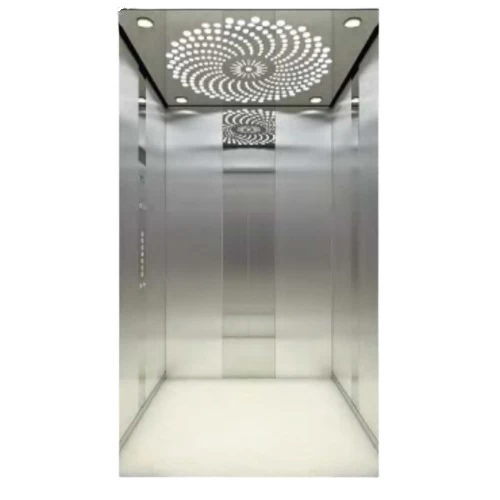 مصعد داخلي بتصميم عصري يجمع بين البساطة والأناقة، يتميز بجدران من الستانلس ستيل المصقول وتشطيب مرآة يمنح إحساسًا بالاتساع. السقف يحتوي على زخرفة إضاءة أكريليك مميزة مع مصابيح LED مدمجة، توفر إضاءة ناعمة ومريحة. لا يحتوي على درابزين لتوفير أكبر مساحة ممكنة. مثالي للفيلات والمباني السكنية الخاصة.