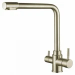 خلاط مطبخ نحاس، لون ذهبي مطفي، يتميز بحاجته إلى تجنب المواد الكيميائية الحارقة أثناء التنظيف.