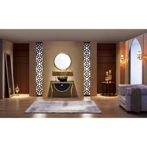 خزانة حمام مع مغسلة ومرايا  دائرية، لون أسود مع زخرفة ذهبي،  105 سم | مجموعه سمايل