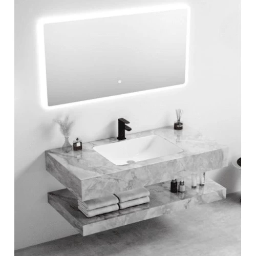 مغسلة رخام صناعي حوض واحد، مقاس 60×50 سم، لون رمادي فاتح، مع مرايا ليد