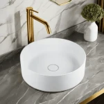 حوض مغسلة دائري مودرن، لون ابيض مقاس 39x39 سم، تتميز بأنها قطعة محورية تجذب الأنظار في ديكور الحمام.