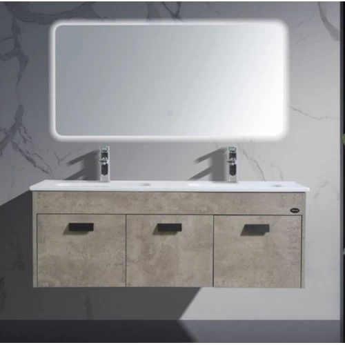 مغسلة حمام حوضين خشب بلايوود مودرن عرض 120 سم، عمق 48 سم، ارتفاع 50 سم، مع مرايا ليد بلون خشبي، يتميز بخامات عالية الجودة وقدرته على مقاومة الماء، بالإضافة إلى مراية مزودة بإضاءة LED تعمل باللمس.