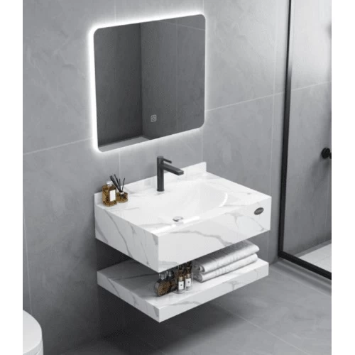 مغسلة رخام صناعي لامع مع حوض يمكن قصه بالليز مع مرايا ورف، حيث انها مزودة بإنارة ليد في منتصف المغسلة لتعطي مظهر انيق كما انها مصنعة من مواد عالية الجودة، مما يجعلها مقاومة للخدوش والبقع والتصدعات. تتميز بمظهرها الجذاب والأنيق وتوفير مظهر فاخر وعصري على ديكور أي حمام. كما تتوفر بأشكال وأحجام وألوان مختلفة لتناسب جميع الأذواق والأنماط الديكورية.