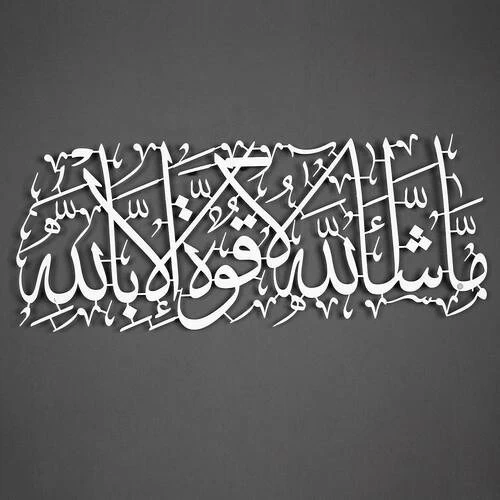 ما شاء الله لا قوة إلا بالله - لوحة معدنية جدارية، الأبعاد 99 × 40 سم، لون فضي، مصنوعة من مواد صديقة للبيئة، تضيف لمسة جمالية شرقية. مثالية للاستخدام في المساحات الداخلية والخارجية بفضل متانتها وألوانها المشرقة.