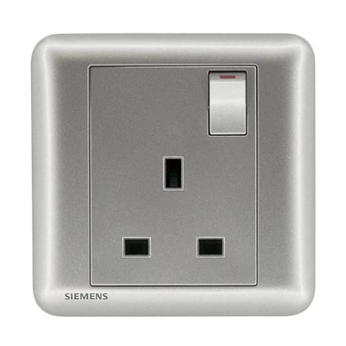فيش كهرباء مفرد 13 امبير مع مفتاح تشغيل ومؤشر، فضي داكن، 86×86 مم، 250 فولت، ماركة سيمنز (دلتا سيتا). مصنوع من مواد عالية الجودة تتحمل الحرارة العالية والتآكل والمواد الكيميائية