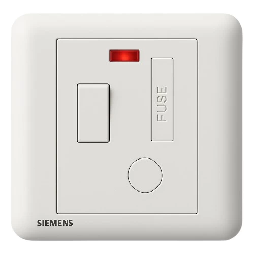 مخرج فيوز كهربائي 13 أمبير ثنائي القطب مع مفتاح تشغيل ومؤشر،مقاس 86×86 مم، لون ابيض، ماركة سيمنز (دلتا سيتا). يستخدم لتوصيل الأجهزة الكهربائية ذات الاستهلاك العالي بشكل دائم، وغالبا يكون مخفيا عن المستخدم ولا يُفصل منه الجهاز يوميا.