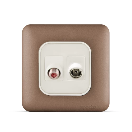 فيش تليفزيون مائل مفرد + فيش دش مائل مفرد، مقاس 7×7 سم، لون نحاسي، من انتاج شركة اكفأ الحديثة (سبكترا)، مجهزة بآلية حماية ضد ماس كهربائي قصير الدائرة، حيث تقوم بفصل الدائرة الكهربائية فوراً في حالة حدوث أي ماس، مما يضمن سلامة المستخدم والأجهزة.