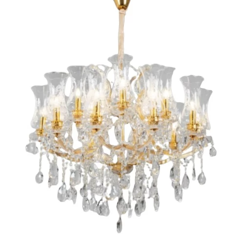 إضاءة كريستال علاقي 16 ذراع، طول 110 سم، عرض 90 سم، لون ذهبي، رقم الموديل 4704، يضفي طابعًا من الرقي والفخامة على أي مساحة داخلية، متوفرة بأشكال وأحجام متعددة.