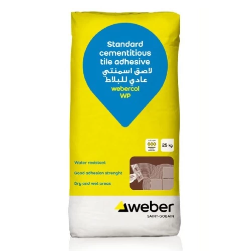 Latex Cement Based Tile Adhesive Webercol WP, SODAMCO-Weber Brand, Slip and water resistant, used for indoor and outdoor flooring, Specially designed for ceramic tiles, used to install a wide range of tiles, used for parking lots, bathrooms and staircase tiles.
