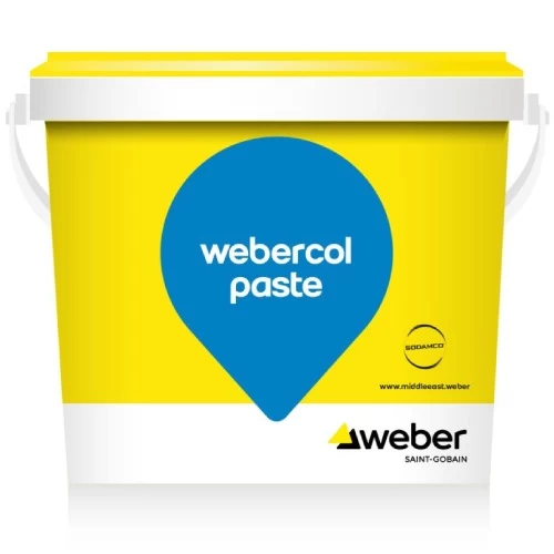 Pasty Tile Adhesive Webercol Paste, SODAMCO-Weber Brand, size 25 kg, Color White, Ready to use based solely on resins, fillers and plasticizers, it is used in wet areas such as kitchens and bathrooms as well as other internal dry areas of floors and walls for a wide range of tiles characterized by non-slip and easy application.