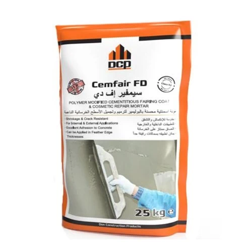 Cemfair FD-E, DCP Brand, Cementitious mortar for concrete repair, It is characterized by ease of application and excellent adhesion strength, shrinkage treated which reduces the occurrence of any cracking, consists of one component that only requires the addition of water, compatible with other types of protective coatings, suitable for indoor and outdoor applications.
