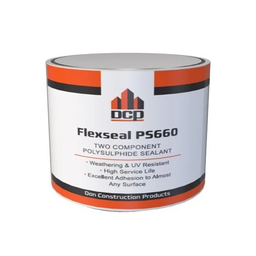 Polysulfide Crack Filler Putty Flexseal PS660, Brand DCP, Can Size 2.5 Liter, Color Gray, Suitable for use on concrete, stone, metal and many common construction surfaces. It is two-component and dries after mixing the two components to form a flexible rubber filler. Good adhesion, cold applied. Long shelf life.