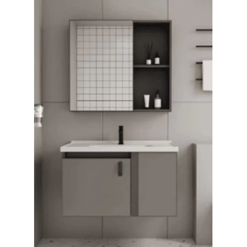 Aluminum decorative sink wall hung vanity unit with mirrored medicine cabinet, ceramic basin, size 80 cm, with mirrored pharmacy, grey. It is characterized by being treated to resist water and moisture.
