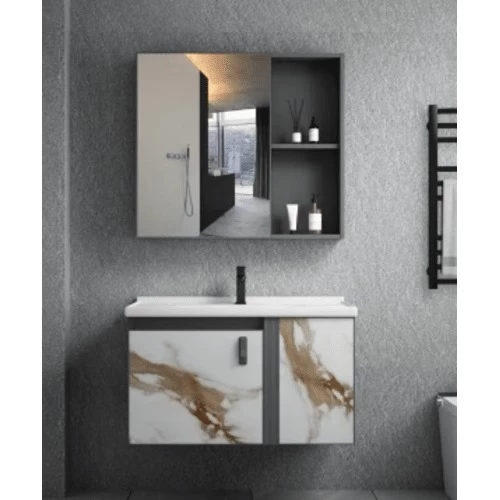 Aluminum wall hung vanity unit, ceramic basin, made of treated aluminum to resist water and moisture, ensuring a long service life. In addition to its elegant modern design that adds a touch of elegance to the bathroom decor, it also provides ample storage space to meet all your needs. Available in various sizes and colors to suit all tastes.