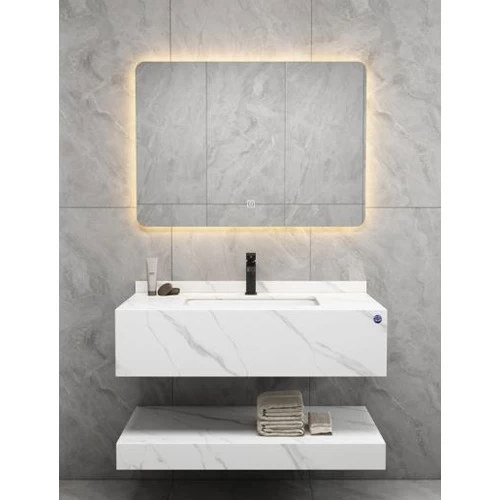 Artificial Marble Normal Basin with LED Mirror 100 cm, White With Lead Veins