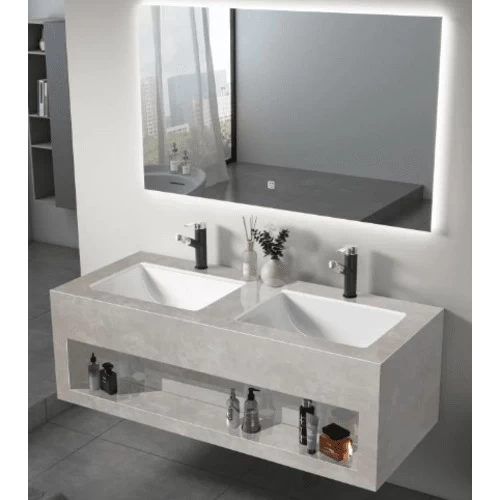 Artificial marble sink, with two ceramic basins and LED mirror, made of high quality materials, making it resistant to scratches, stains and cracks. It also features two basins instead of one, making it ideal for places where more than one person shares the same time without crowding, such as family bathrooms or guest bathrooms. It also features an attractive and elegant appearance and provides a luxurious and modern look to the interior decor. It is also available in different shapes, sizes and colors to suit all tastes and decorative styles.