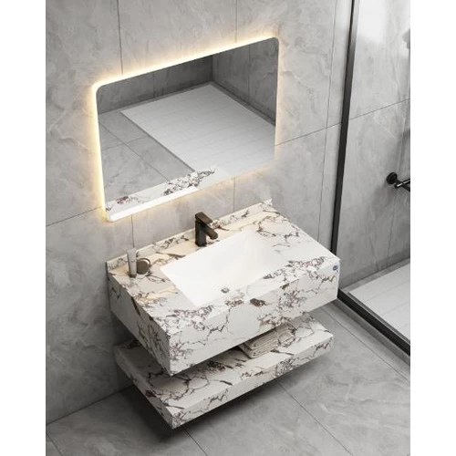 Artificial Marble Washbasin Size 100 cm, Laser Basin with LED Mirror, White and Brown