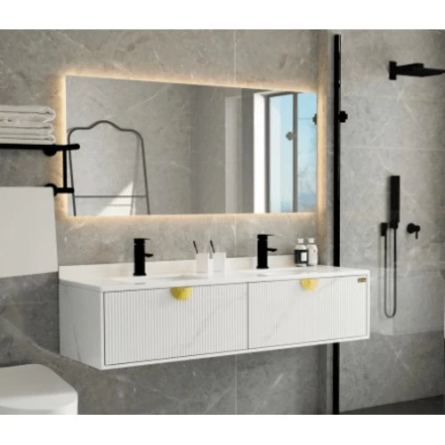Decorative washbasin with 2 basin and with a wooden cabinet that adds a touch of elegance and matches the decor, and gives a luxurious look to the place, made of treated wood to resist water and moisture, in addition to the presence of LED mirror with touch button, ideal for any bathroom that seeks elegance and practicality at the same time, provides additional space to place daily items in an organized and tidy manner, available in different shapes and sizes with the highest quality and best prices