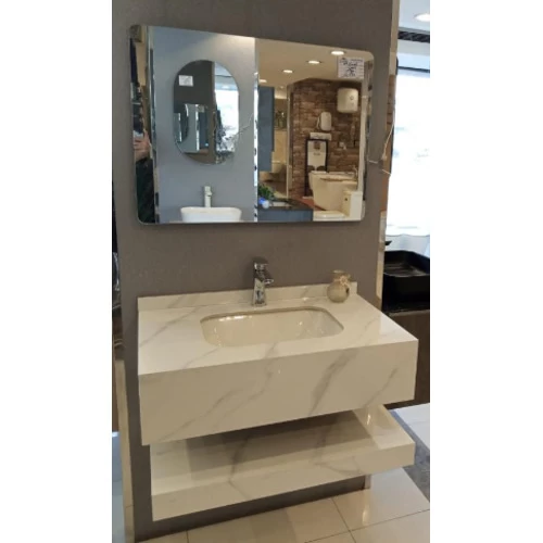 Artificial marble sink, with single ceramic basins and LED mirror, made of high quality materials, making it resistant to scratches, stains and cracks. It also features two basins instead of one, making it ideal for places where more than one person shares the same time without crowding, such as family bathrooms or guest bathrooms. It also features an attractive and elegant appearance and provides a luxurious and modern look to the interior decor. It is also available in different shapes, sizes and colors to suit all tastes and decorative styles.