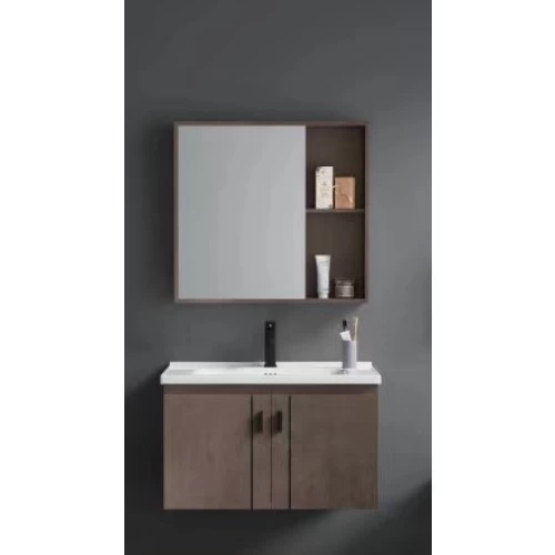 Dark wood bathroom vanity, 80 cm, modern design with mirror and medicine cabinet that keeps your bathroom stylish and organized. Made from moisture-resistant treated wood with a durable ceramic basin.