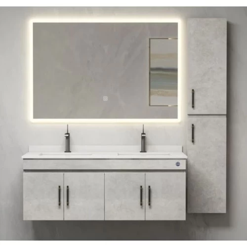 Double basin wooden bathroom wash basin, size 120 cm, with LED mirror, light grey color. Available in elegant decor that gives an aesthetic touch, it also features a side cabinet with soft locks.