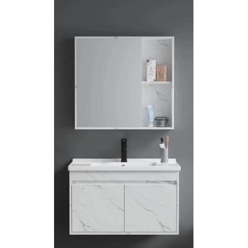 Grey white wooden bathroom vanity with sink, mirror, and medicine cabinet, 80 × 46 cm, featuring a modern design that brightens your bathroom and offers refined organization. Made from moisture-resistant treated wood with a durable, easy-care ceramic basin to keep your bathroom stylish at all times.