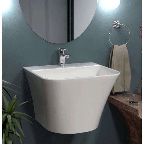 Hanging washbasin, produced by the Saudi Ceramics factory, made of high quality materials, characterized by a modern and elegant appearance and ease of cleaning, suitable for use in small and medium spaces, available in different shapes and sizes with the highest quality and best prices.