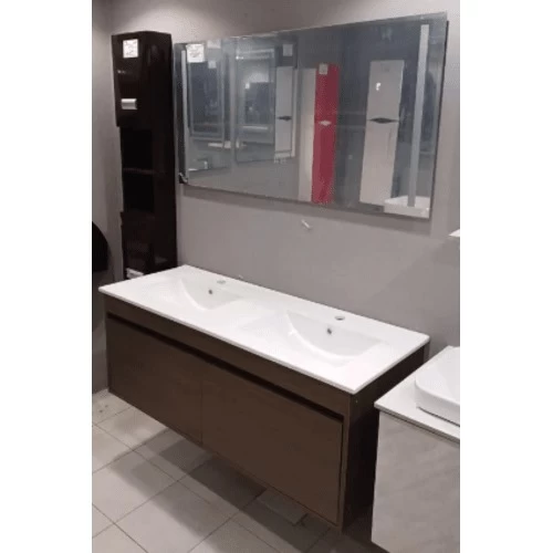 Marble surface ceramic bathroom washbasin double bowl size 120 cm, dark wood color with wooden cabinet. Available in various shapes and sizes, as it suits all categories and at competitive prices.