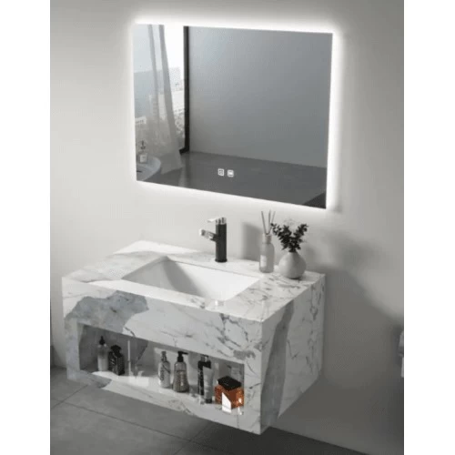 Modern artificial marble wash basin with mirrors and shelf, It is equipped with LED lighting in the middle of the sink to give it an elegant appearance, as it is made of high quality materials, making it resistant to scratches, stains and cracks. It features an attractive and elegant appearance and provides a luxurious and modern look to any bathroom decor. It is also available in different shapes, sizes and colors to suit all tastes and decorative styles