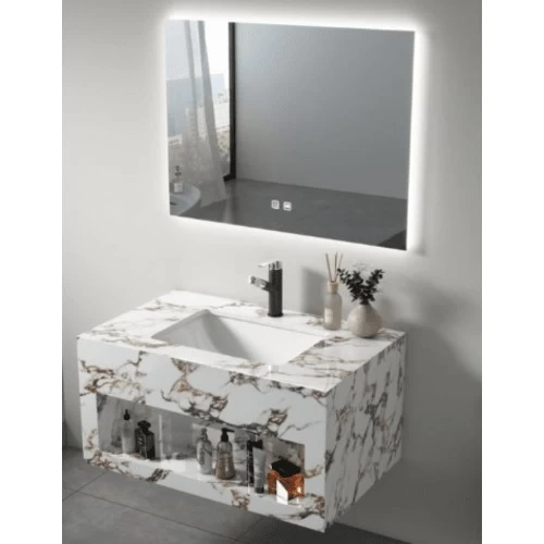Modern artificial marble bathroom wash basin with LED mirrors and shelf, white with golden veins color, size 80×50 cm, it is made of high quality materials, making it resistant to scratches, stains and cracks
