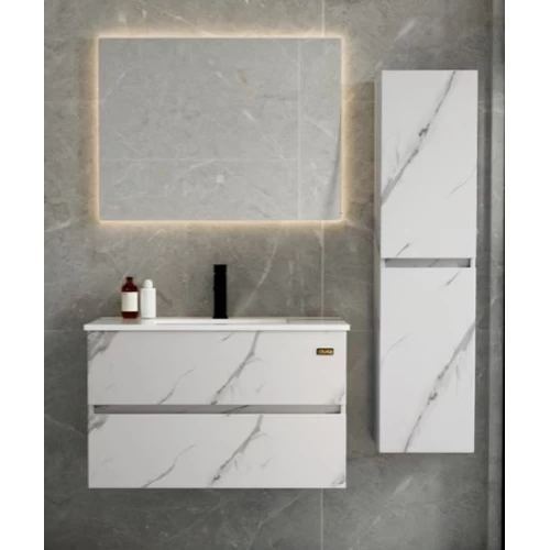 Modern Wooden Washbasin With Ceramic basin LED mirrors and Pharmacy, Marble White Color, Size 80×48×50 cm