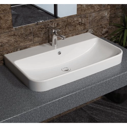 Over counter top washbasin, produced by Saudi Ceramics Factory, made of high quality materials, features a simple appearance with a luxurious touch and modern design, ideal for any bathroom that seeks elegance and practicality at the same time, provides additional space to place daily items in an organized and tidy manner, available in different shapes and sizes with the highest quality and best prices.