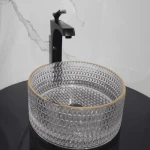 Round crystal wash basin, gold line, 36x36 cm. It is available in multiple colors to suit all decor preferences.
