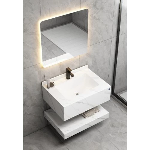 Single Basin Artificial Marble Bathroom 80 cm, Laser Basin with LED Mirror, White with lead veins