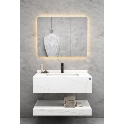 Single Normal Basin Artificial Marble Bathroom with LED Mirror 80 cm, White With Golden Veins Color