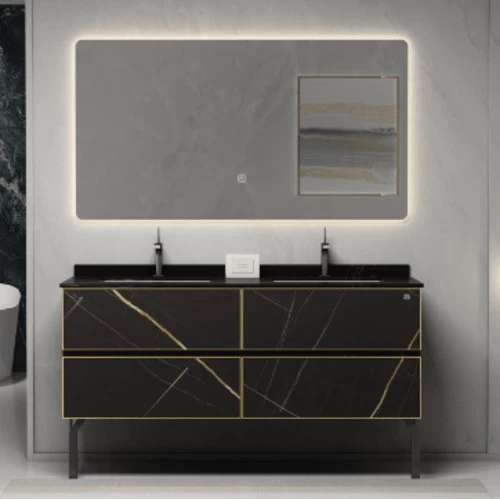 Decorative washbasin with marble top with single ceramic basin and 2 spacious cabinet drawers, wooden cabinet that adds a touch of elegance and matches the decor, and gives a luxurious look to the place, made of treated wood to resist water and moisture, in addition to the presence of LED mirror with touch button, ideal for any bathroom that seeks elegance and practicality at the same time, provides additional space to place daily items in an organized and tidy manner, available in different shapes and sizes with the highest quality and best prices