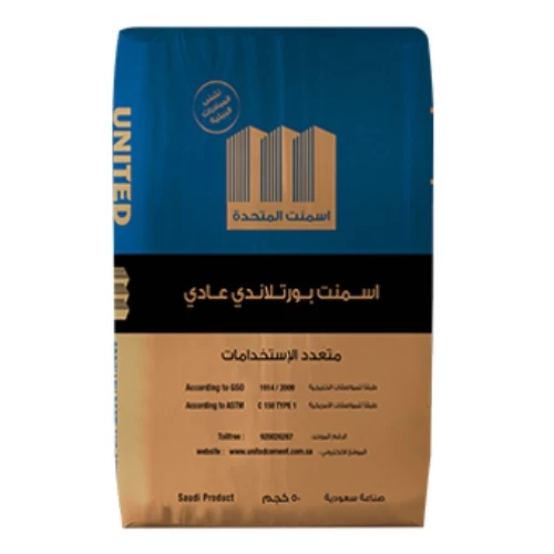 Ordinary Portland cement, weight of 50 kg, from United, used in ready-mixed concrete, bases and foundations, concrete castings in cold climates, bridges and building towers, concrete roads, is characterized by rust resistance, applications of ordinary reinforced concrete mixtures that do not require special types of cement.